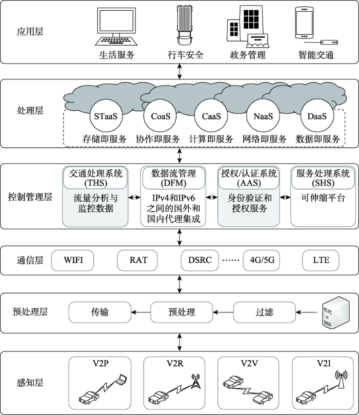 该架构提供了多种服务类型,在第五层处理层中主要包含以下几大类核心功能模块:存储即服务(SaaS模式)、协作即服务(CoaS)、计算即服务(CaaS)、网络即服务(NaaS)以及数据即服务(DaaS)。这些功能模块均负责接收并处理来自车辆节点的相关数据,并通过智能分析技术对收集到的数据进行深入分析和处理以实现服务质量的有效提升。