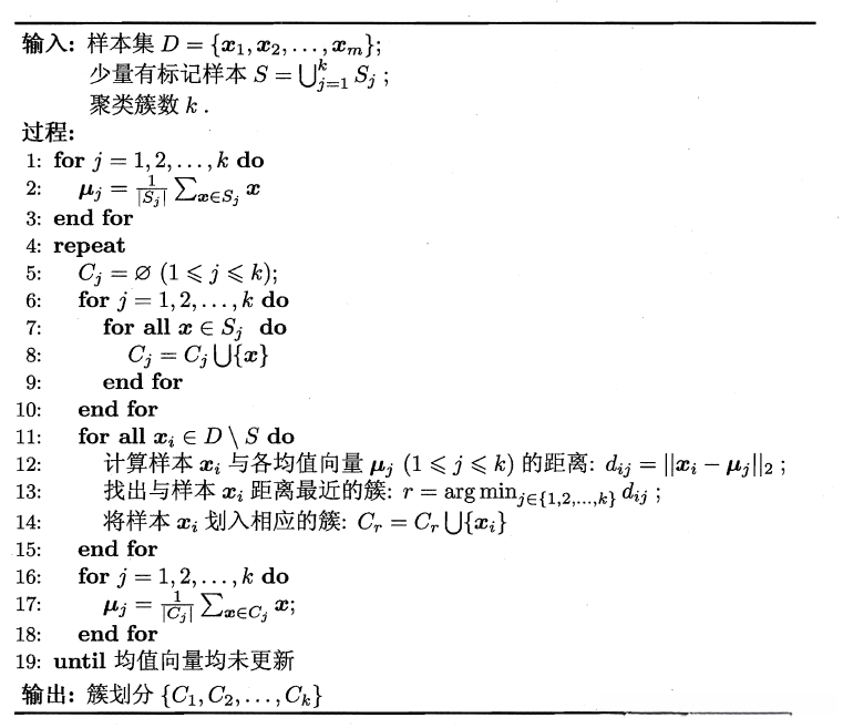 该算法是k-means的扩展,将有标记样本作为种子样本,初始化时直接使用同类种子样本的均值作为簇中心,每次迭代不改变种子样本的隶属关系 。