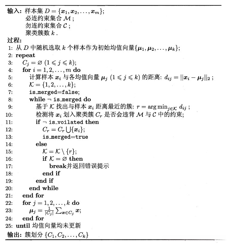 给定数据集D,以及“必连”关系集合M和“勿连”关系集合C,(x_i,x_j)\in M表示必同簇,(x_i,x_j)\in C表示必不同簇。