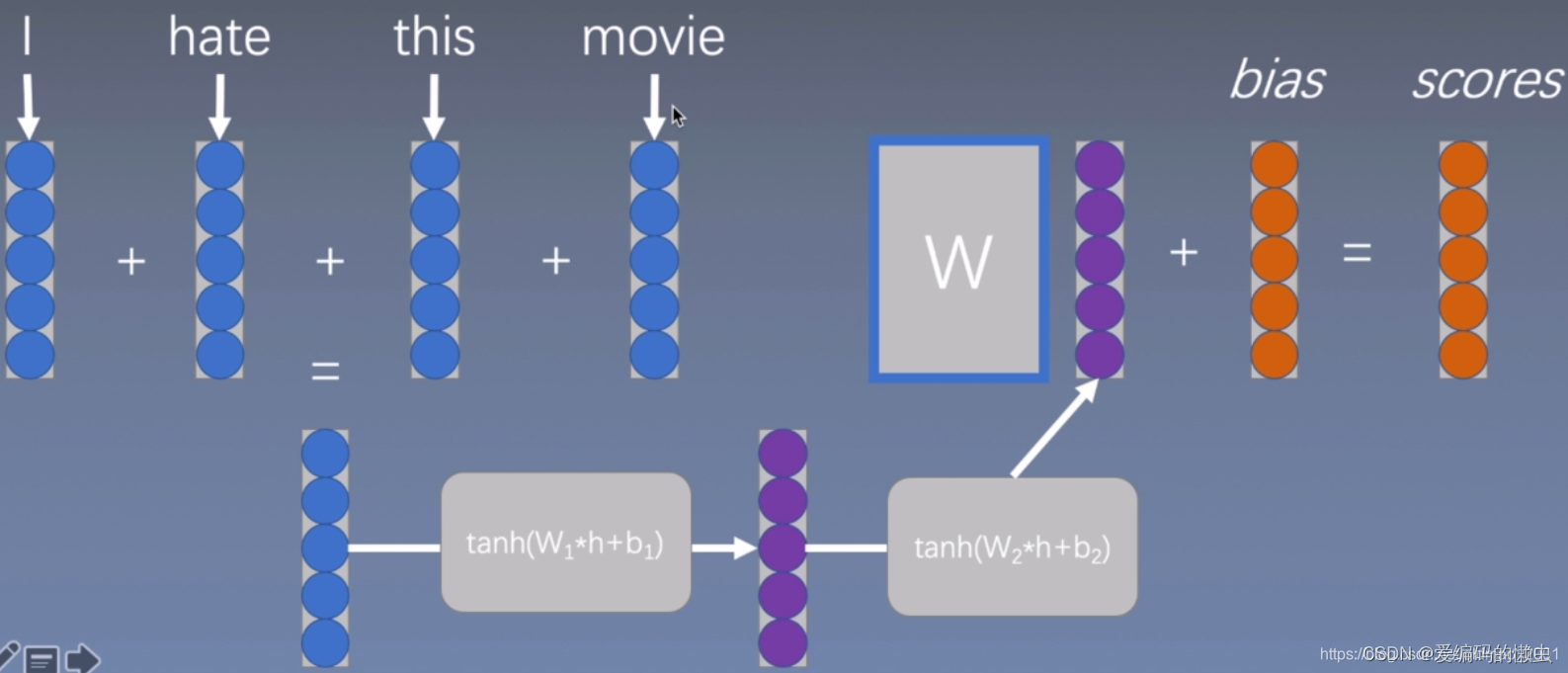 首先利用word2vec或其他技术将词语编码为向量表示(通过查证字典的方式确定每个词语的具体数值),随后将这些词语的向量表示进行简单求和运算,并加入一个偏置项以生成分数scores;最后应用softmax函数来进行分类任务。