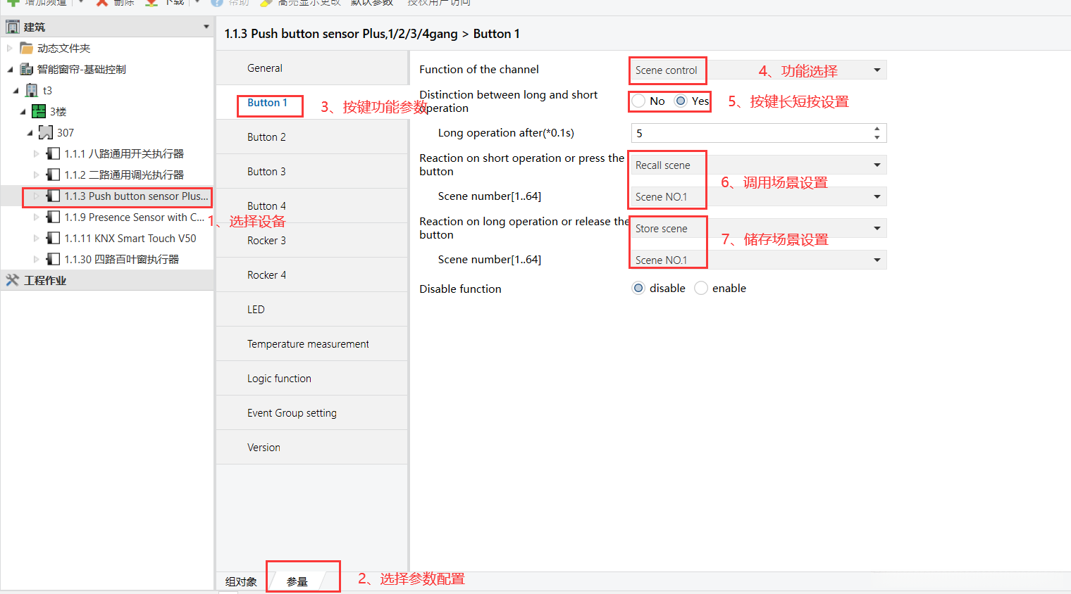 4、8个智能按键控制界面的参数配置 该系统通过8个智能按键控制界面实现对4组窗帘模块预设状态的调节功能参数配置,并主要依赖'Scene control'功能来完成相关操作。具体操作步骤将以Button 1通道为例进行说明。