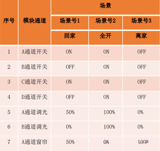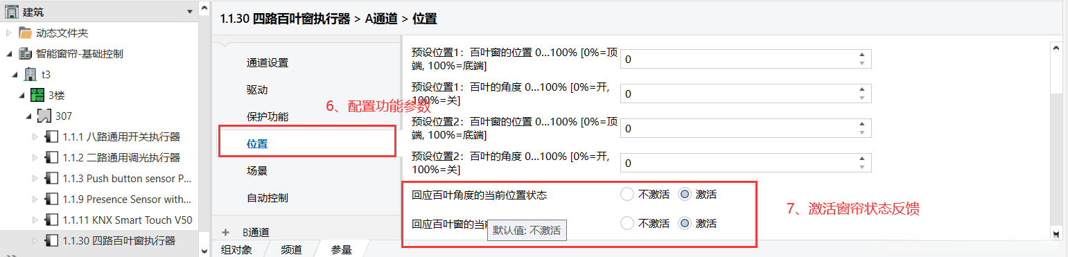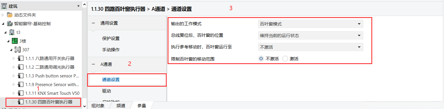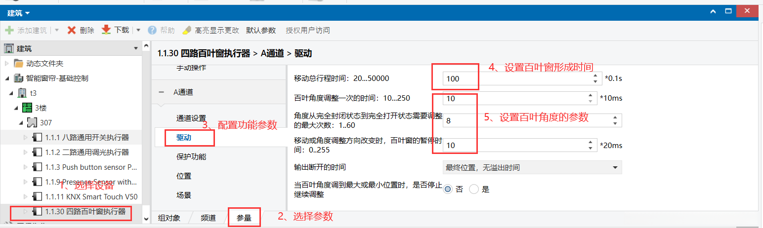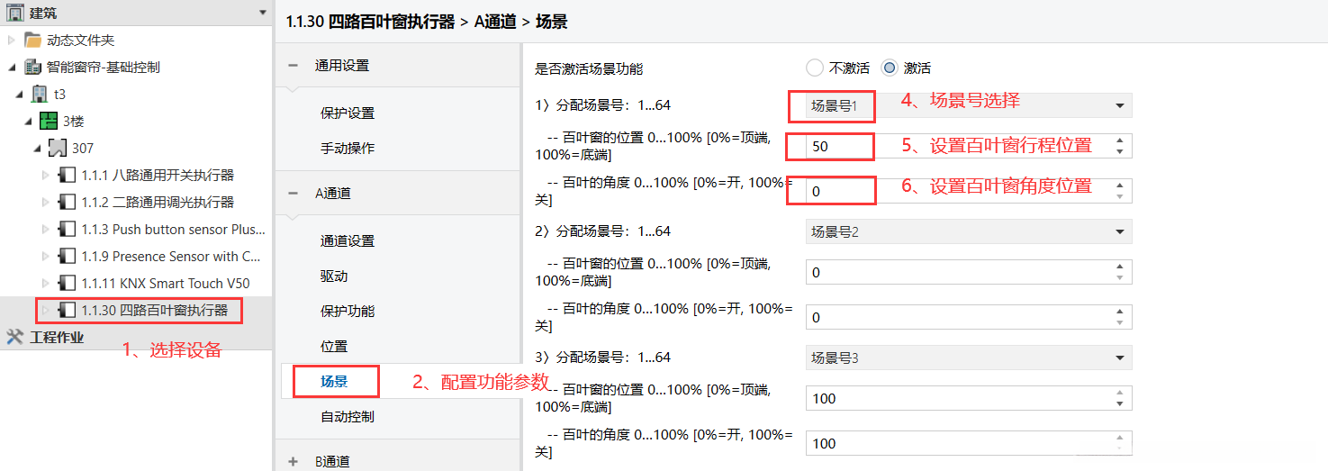 2、四组窗帘控制参数配置 4路场景功能参数设置(例如A通道的场景功能参数配置) 场景配置前期准备工作