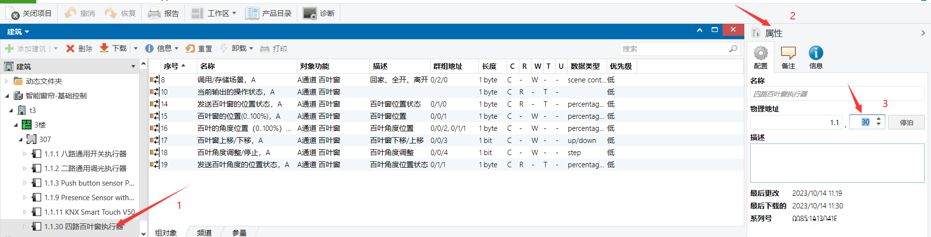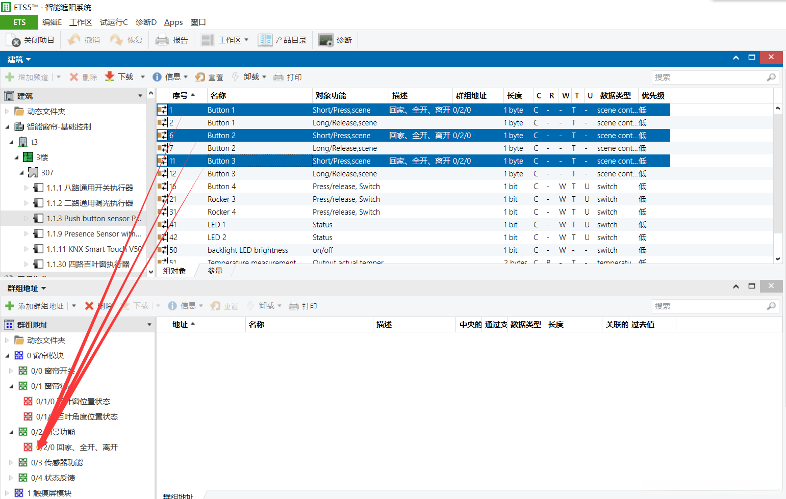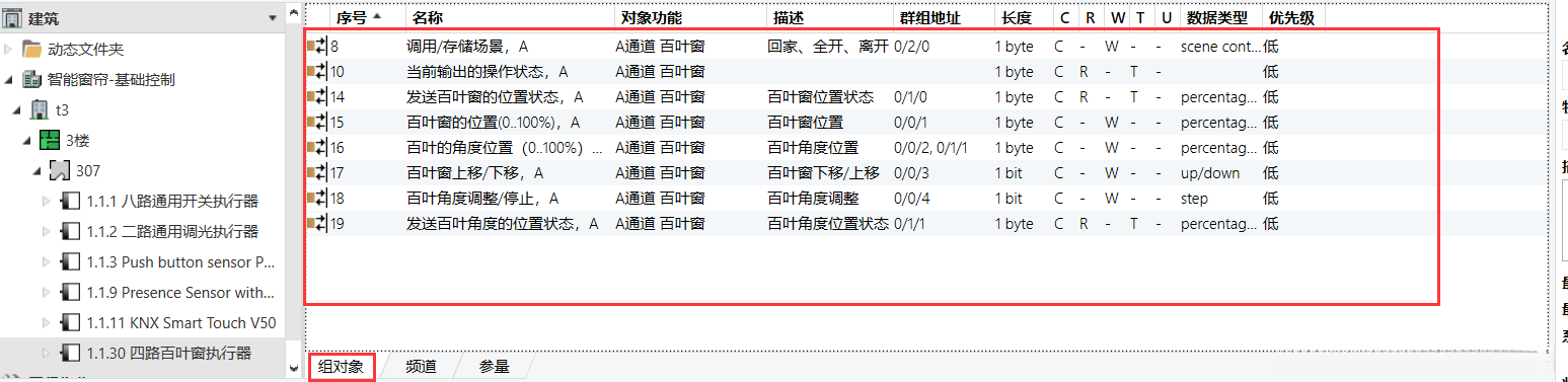 首先选中4路窗帘模块与8键智能按键面板的通信对象,并将其拖放到与其对应的目标地址。随后完成对该组的窗帘控制功能实现