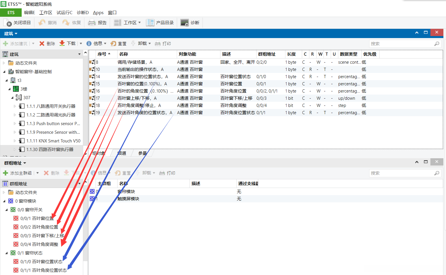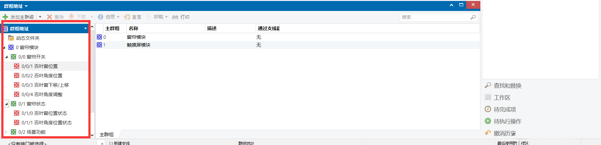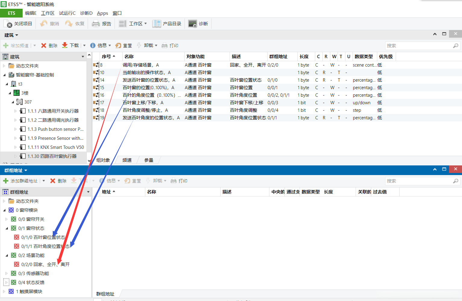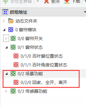 对应的位置,请将4路窗帘模块的关联对象拖放到与之匹配的群组地址上。4路窗帘模块的关联对象匹配