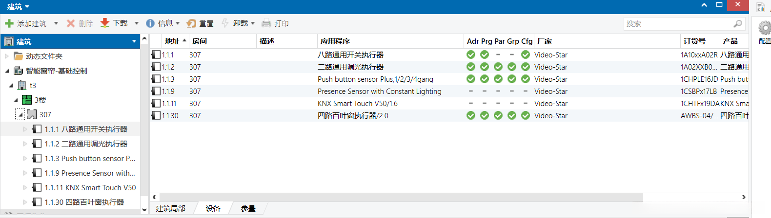 首次全面安装系统物理地址及应用程序时,请务必按下工程按钮以启动安装流程。参考下图所示: 已安装了4套窗帘控制模块
