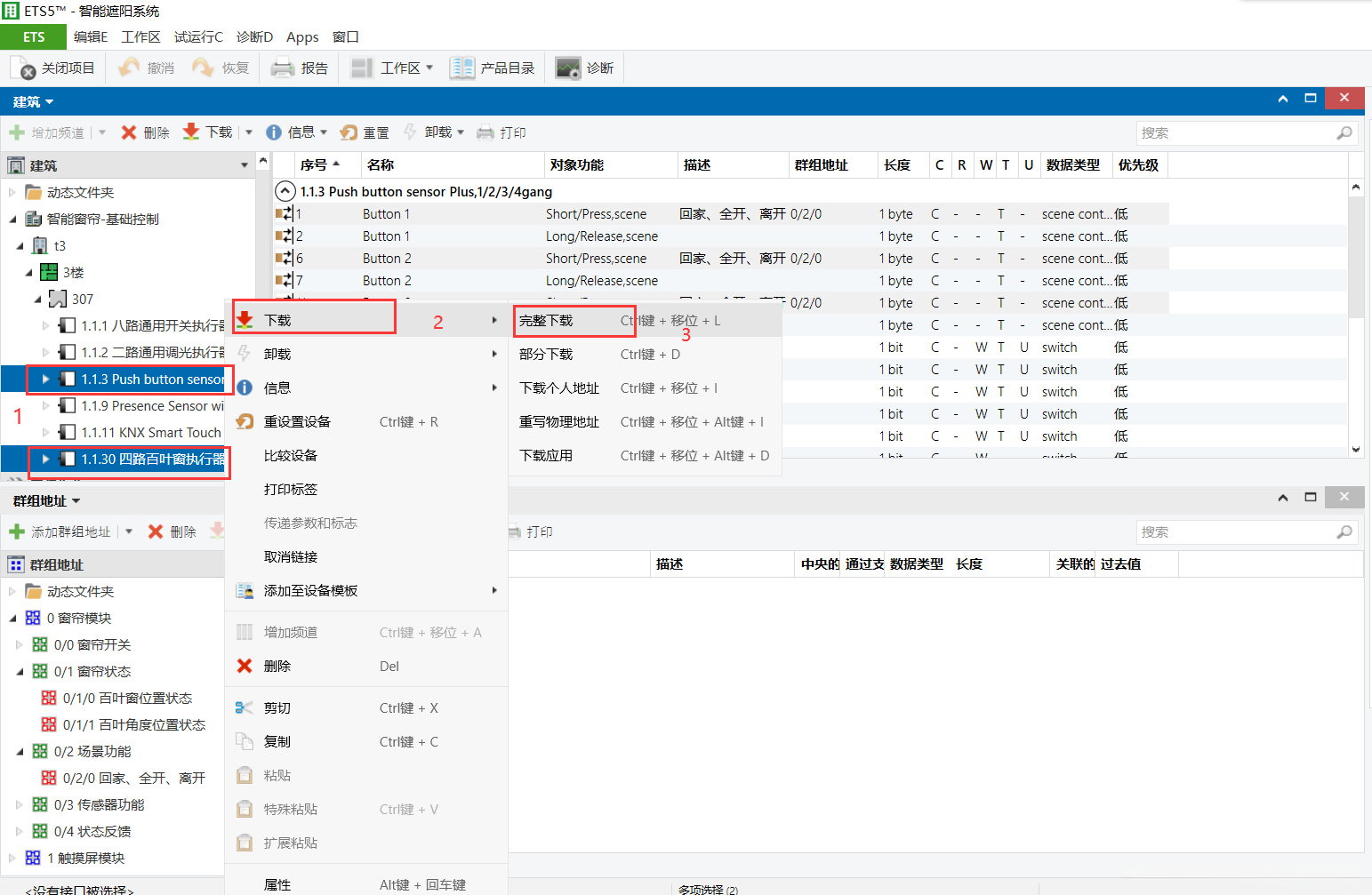 该系统提供了一个明确的应用路径及操作指导:首先请依次点击位于4路窗帘模块和8键智能按键面板上的数据库位置;随后右键单击后选择"下载"选项并完成整个下载流程;最后按照从左至右、从上至下的顺序依次按下位于4路窗帘模块和8键智能按键面板上的编程控制键。