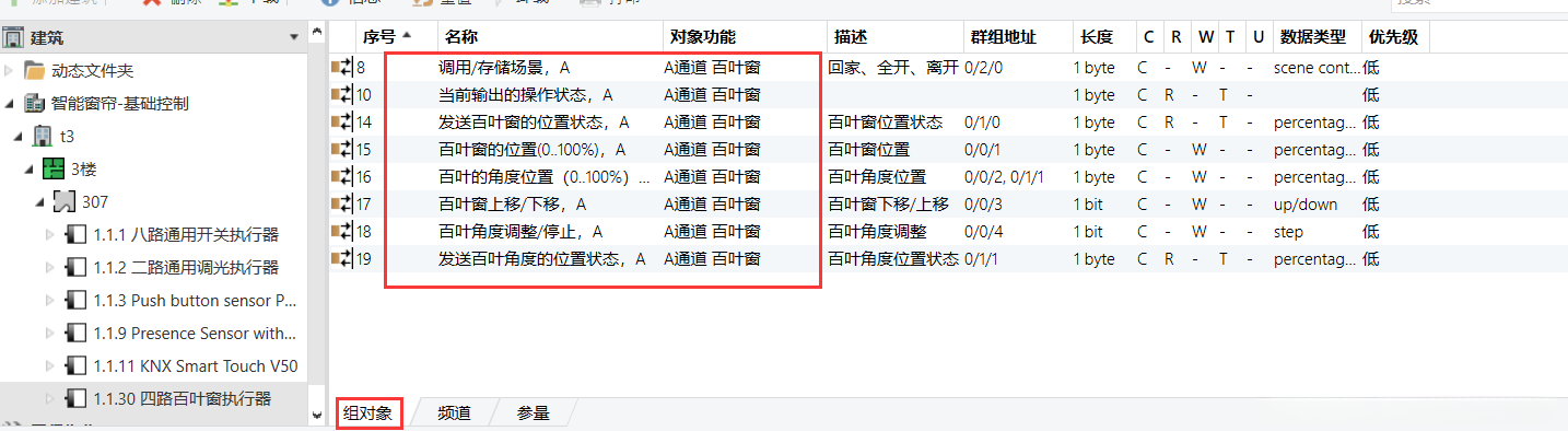 当4路窗帘模块全部配置完毕后,勾选"参数"旁边的"组对象"功能,即可查看已设置的各组参数:场景编号X,当前输出状态,X;百叶扇位置状态,X;百叶角度位置(0-180度),X;百叶升降操作,X;上下调节操作,X;扇角度位置状态,X等各项功能