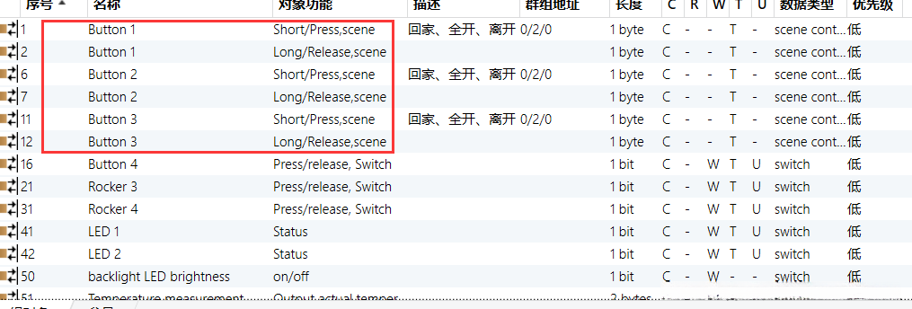 一旦8键智能触摸面板完成参数设置后,通过点击"参数"旁的"组对象"按钮,就可以浏览到已经配置好的各项功能选项,包括如"Button X 短按场景","Button X 长按场景"等具体设置项.