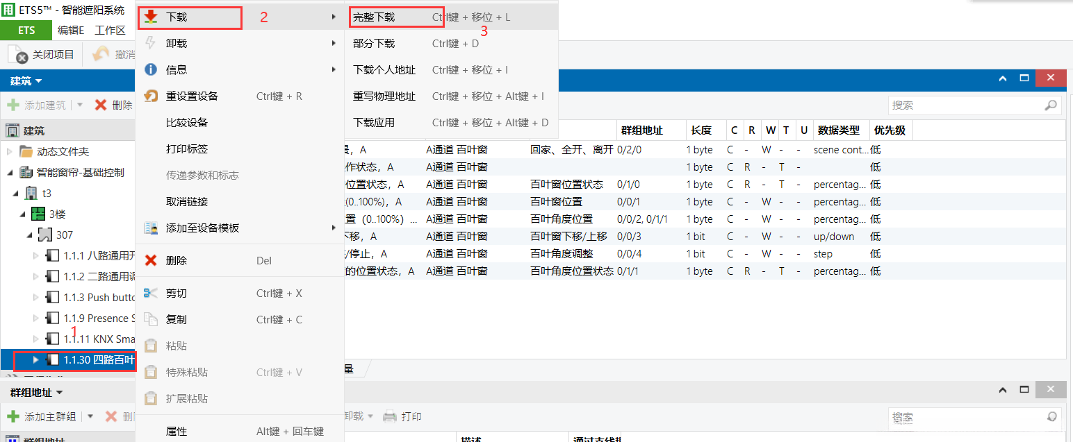 打开4路窗帘模块的数据库,并按照以下步骤操作:单击右键菜单中的"下载"选项,并选择完整的文件进行保存。随后依次执行以下操作:按下4路窗帘模块的编程按键完成配置设置。