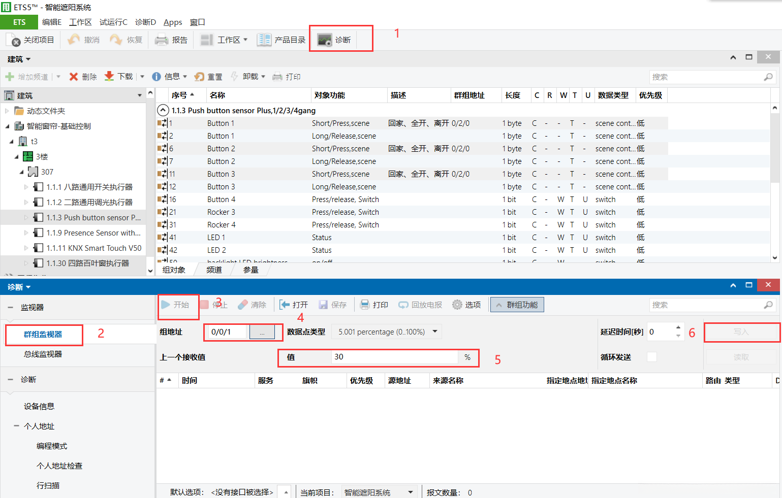 在线调试时,请单击位于快捷键上方的“诊断”按钮。依次选择群组监视器 → 点击开始按钮 → 选择目标组地址 → 启停开关 → 写入数据。