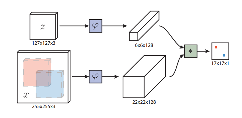 定义函数f(z,x),用于衡量模板图像z与候选图像x之间的相似程度。系统会遍历所有可能进行比较,并选择具有最高相似度的配对以确定目标位置。