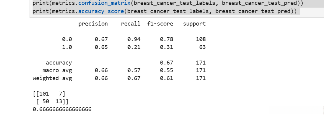 可见,对于108个良性样本,模型正确预测了106个,只有2个样本预测失败。 对于63个恶性样本,模型预测正确的有56个,正确预测比例为88.9%。 模型的整体预测正确率为 (106 + 56)/ 171 = 94.7%。 虽然这个正确率看起来很高,但是假阳性样本还有7个,这在实际医疗诊断中是严重的失误,因为将一个患有乳腺癌的患者诊断为良性会给患者带来严重的后果。 下一步,我们需要进一步寻找提升模型效果的方法。