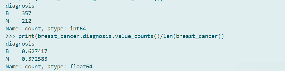 print breast_cancer.diagnosis.value_counts()/len(breast_cancer)