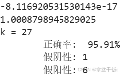 可见,当 k = 27时,假阴性数量最少,且假阴性数量仅为6,正确率达到最高。当然,这也只是在171个测试样本上的结果。