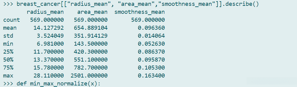 观察这三个变量的统计信息,发现它们的取值范围不大一致。 radius_mean取值范围为6.98128.110,area_mean取值范围为143.52501.0,smoothness_mean取值范围为0.05263~0.16340。不同变量的测量尺度不一致会影响K近邻算法中的样本距离计算。 例如,如果上述三个变量直接参与距离计算,则area_mean变量将会对距离计算影响最大,从而会导致我们构建的分类模型过分依赖于area_mean变量。在应用K近邻等涉及距离计算的算法构建预测模型之前,我们需要对变量取值进行标准化。