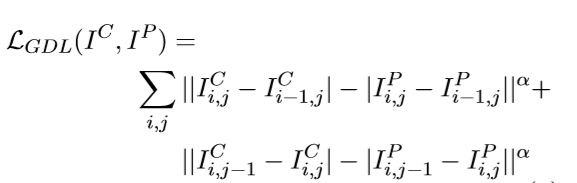 一般情况下, 生成模型往往会输出较为模糊的画面. 研究者建议通过强化生成器在图像梯度预测方面的准确性来优化视觉效果. 这种方法旨在通过减少与参考标准图像IC之间的梯度预测误差, 进一步提升生成质量. 其中, IP表示网络输出的结果图像是G在输入ID上的映射结果; α是一个大于等于1的整数; 梯度差损失(GDl)则由以下公式给出: