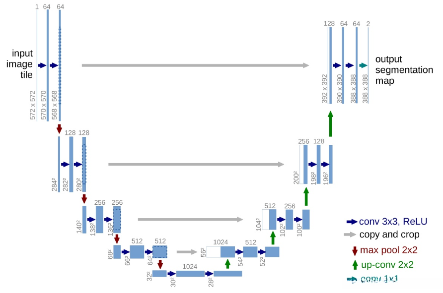 unet网络可以简单看为先下采样,经过不同程度的卷积,学习了深层次的特征,在经过上采样回复为原图大小,上采样用反卷积实现。最后输出类别数量的特征图,如分割是两类(是或不是),典型unet也是输出两张图,最后要说明一下,原网络到此就结束了,其实在最后还要使用激活函数softmax将这两个类别转换为概率图,针对某个像素点,如输出是[0.1,0.9],则判定这个像素点是第二类的概率更大。
