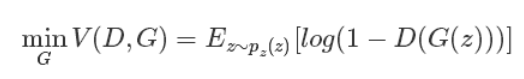 当优化生成器G的过程中,在没有真实样例的情况下(即仅有假样本),因此选择丢弃第一项。此时我们仅依赖于假样本,并期望这些假样本的判别结果为1(即D(G(z))应尽可能大)。然而为了使判别器的目标形式一致(将其统一为一个连续的目标函数),我们需要最小化表达式(1 - D(G(z)))。这种处理方式本质上与直接最大化D(G(z))并无区别;只是出于形式上的统一性考虑而采取了不同的表达方式。随后将这两个优化模型整合后,则可简化为最初的最小化最大化的目标函数函数结构。