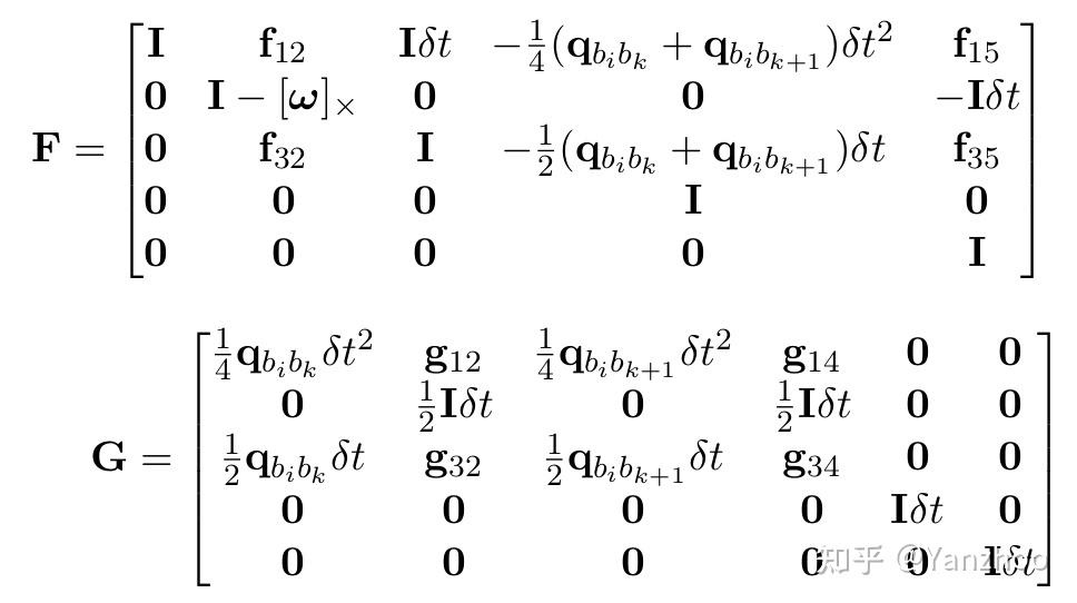 F.block<3, 3>(6, 9) = -0.5 * (delta_q.toRotationMatrix() + result_delta_q.toRotationMatrix()) * _dt;