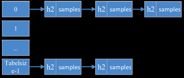 然而这样会导致计算结果为N_1,N_2,\dots,N_k(其中每个N_i都属于整数域而非仅取0或1两个值),这相当于定义了一个'桶'。如果直接将这些元组作为哈希表的键,则会占用过多内存资源;不仅占用内存较大,并且这种存储方式不利于快速查找所需数据。为了提高存储效率和减少资源消耗,在设计阶段采用了层次化方法:通过结合数组与链表的方式进行组织(如图所示)。