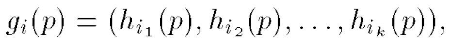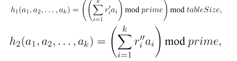对于所有k元组形式的桶编号,在算法设计中我们通过以下定义的两个函数来计算得到两个数值:其中通过调用该函数得到的结果表示目标数组的位置,并且该数组的实际容量与哈希表的大致规模相当;而另一个函数则返回一个唯一标识符,并将其关联到对应目标位置处所对应的链表元素上。其中r’是在区间[0, prime-1]内通过均匀分布随机数生成器来确定的一个整数值。