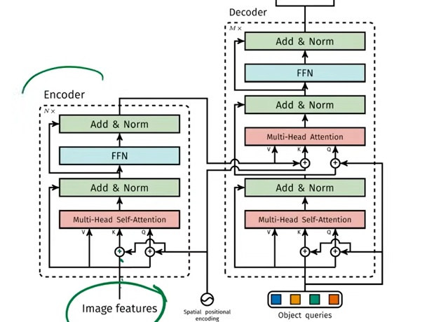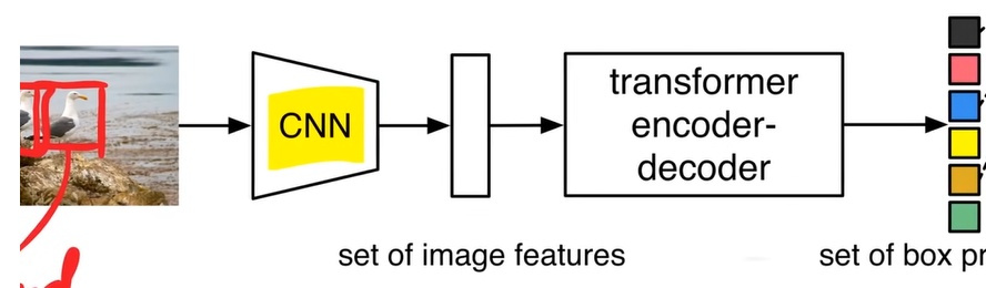 首先,图像通过CNN产生一系列的图像特征编码。通过CNN,图像的尺寸被压缩,但是特征通道数被增加。之后,图像特征被输入到transformer中,并输出一系列识别框的包围盒和框内对象的类型(包含空类型)组成的对。