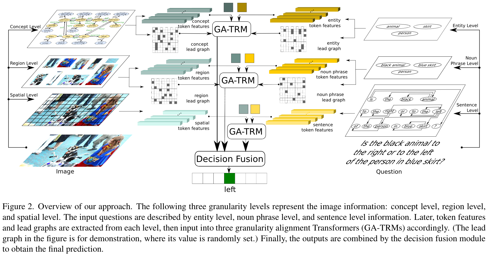 第一步是从输入图像中识别出一系列物体及其相关属性与关联关系。在问题识别阶段,则被检测出包括名词短语、实体以及句子语法结构等多个关键要素。随后利用lead graph进一步引导对齐学习,并根据上述步骤中提取的结构信息构建它们;这些构建过程将被划分为概念级与实体级要素、区域级与名词短语级要素以及空间级与句子级要素三大类基本组成单元。最后将这三个层级上的GA-TRM模型进行集成处理,并基于此预测最终答案。