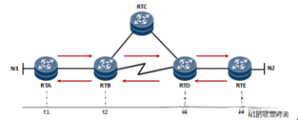 根据图示,在N1网络出现状态变化时(如图所示),系统会通过RTA发起状态更新通知。接收该指令后,在接收到状态更新指令后(即立即),RTB将执行相关处理,并在完成本地处理后发送相关路由信息通知 RTC(即 RTC)。此流程会持续进行直到达到稳定状态(即完成计算并反馈)。值得注意的是,在逐级收敛机制下(即逐跳收敛的方式),该方法可能导致了网络收发效率较低的现象(即造成了一定性能损失)。