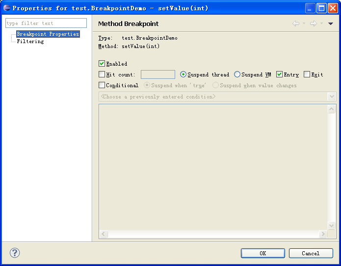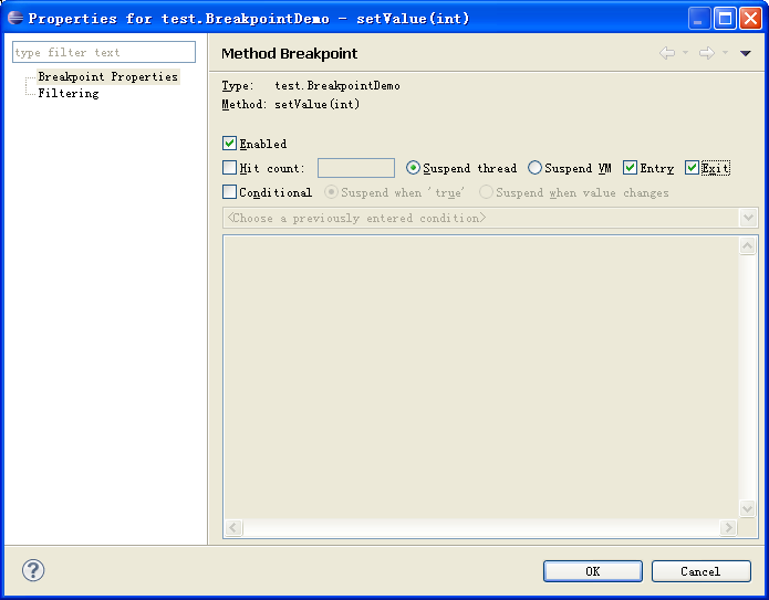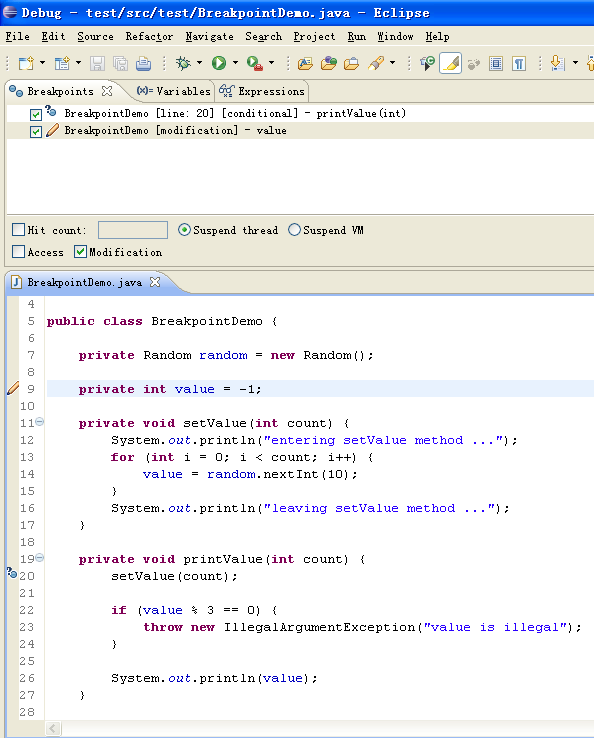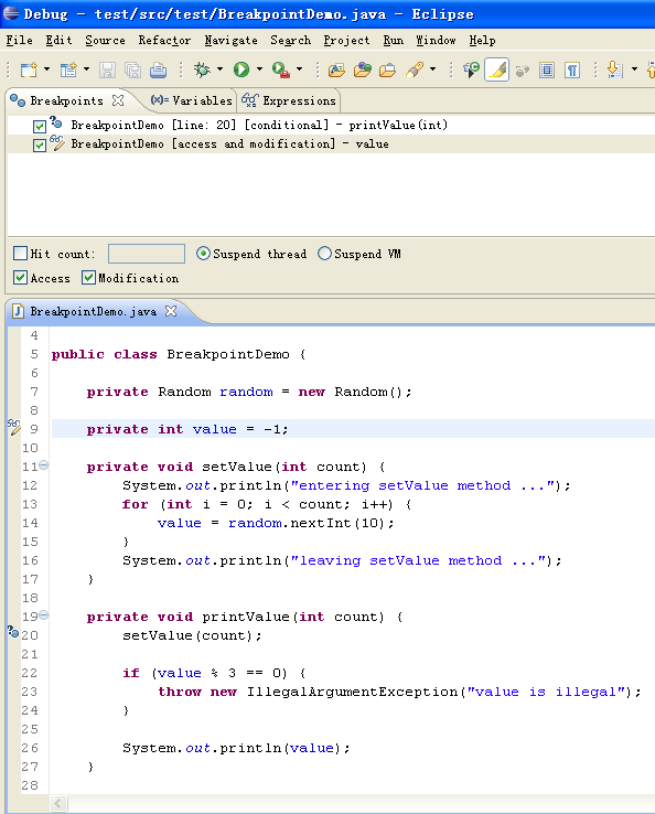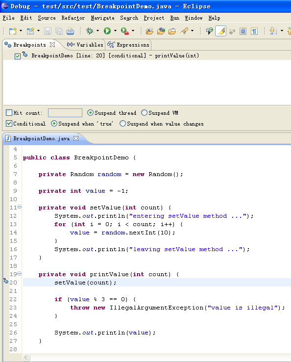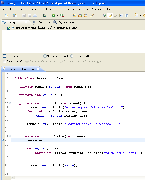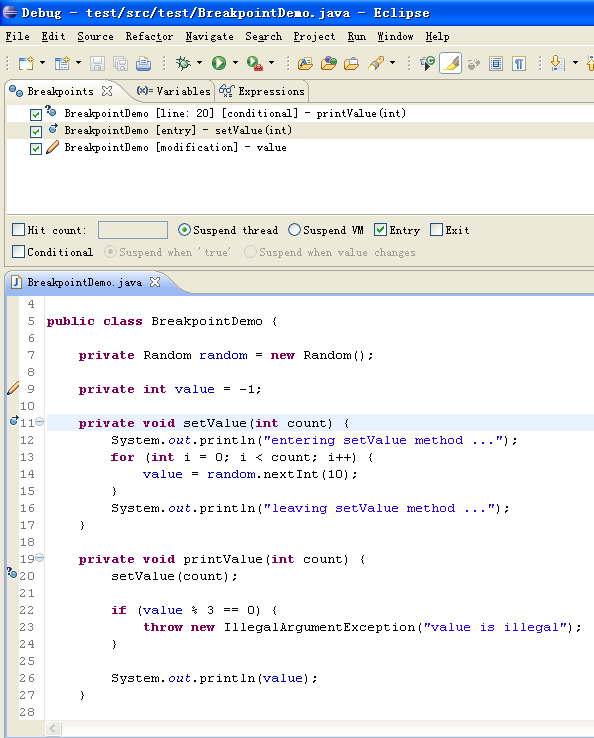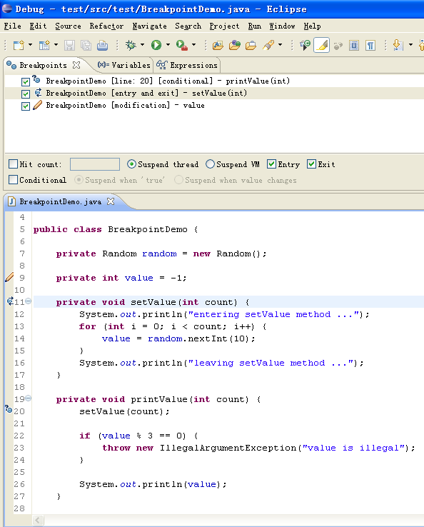 根据这里的设置,当程序运行到第20行后会在第12行被中断,尽管这里没有显式的断点,但这就是setValue()方法的入口(Entry)。必须注意地是,程序在运行到第16行时不会被中断,尽管它看起来像是setValue()方法的出口(Exit)。实际上,程序会在第17行被中断,这里才是setValue()调用结束的地方。