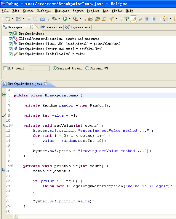 大家肯定都用过Eclipse的调试的功能,在调试的过程中自然也无法避免要使用断点(breakpoint),但不知是否对Eclipse中各类断点都有所了解。本篇图文并茂地介绍了Eclipse中全部类型的断点,及其设置,希望对大家有所帮助。(2011.11.20)