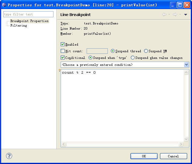 可以为Line Breakpoint设置一个条件,那么当程序运行到该断点时,只有满足设定的条件,才会被中断。右键点击第20行的断点,选择”Breakpoint Properties…”