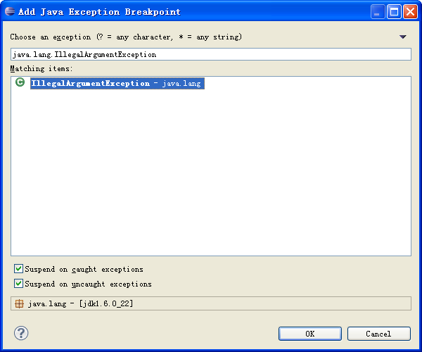 在其中选中IllegalArgumentException,并点击OK,这时一个Exception Breakpoint就设置好了。