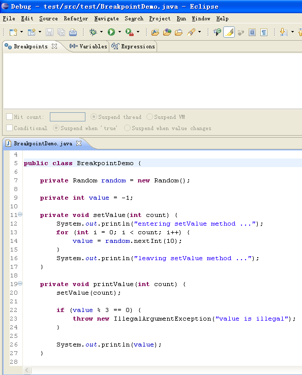 BreakpointDemo是一个臆造的应用程序,只是为了便于讲解Eclipse中各类断点的使用罢了。其代码如下图所示,