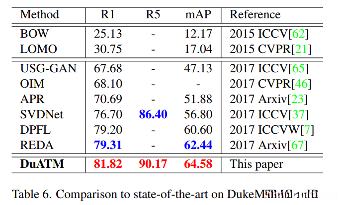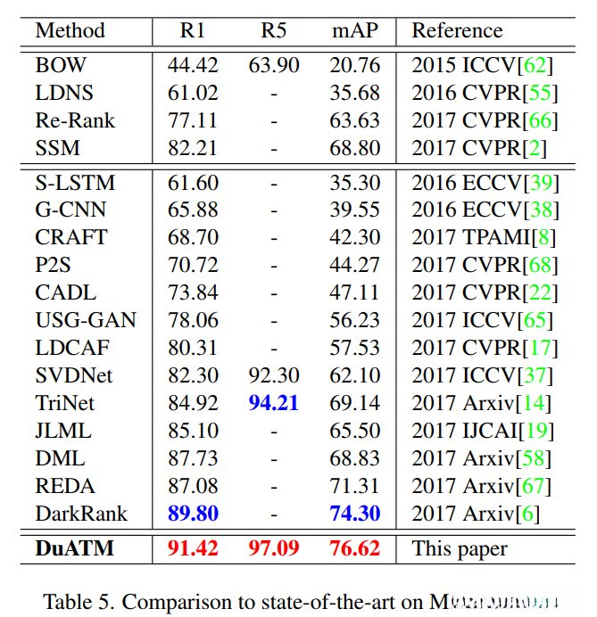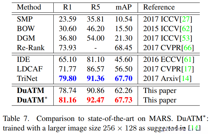 与最先进方法的比较。在表 5、表 6 和表 7 中,我们分别将我们的方法与 Market-1501、DukeMTMCreID 和 MARS 上的最先进方法进行了比较。所提出的 DuATM 在所有这些上都实现了卓越的性能,这进一步证实了我们基于深度上下文感知特征序列的方法的有效性。具体来说,在 Market-1501 和 DukeMTMC-reID 中,DuATM 超越了所有逐步模型和端到端网络,每个数据集的 rank-1 准确率分别为 91.24% 和 81.37%。在 MARS 中,DuATM 仍然优于上述大多数方法。如果我们的 DuATM 像 [14] 那样使用更大的图像尺寸 256 × 128 进行训练,则 rank-1 将是 81.16%,这超过了最先进的结果。