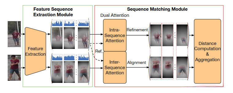 在本文中,我们将注意力机制利用到基于特征序列的人 ReID 中。与现有的通过启发式对应结构比较序列的方法不同,我们尝试通过双重注意过程比较两个序列,其中序列间注意过程用于执行序列比对,同时使用序列内注意过程执行序列细化。