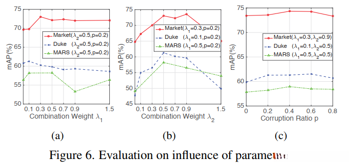 从这些结果中,我们可以得出三个结论:a)虽然适中的值 λ1 可以使序列更紧凑,但过大的 λ1 会损害特征向量之间的上下文关系,导致性能略有下降; b) 适度的 λ2 值可以带来额外的监督信息,但过大的 λ2 可能导致过拟合; c) 性能对参数 p 不敏感。此外,我们发现 DuATM 在 Market- 1501、DukeMTMC-reID 和 MARS。我们在表 1 的底部两行列出了这些结果。