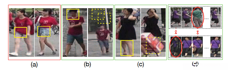 图 1. 个人 ReID 中的硬示例。 (a):具有相似外观的负对。 (b):空间位移较大的正对。 (c):由于遮挡而缺少身体部分的正对。(d):带有干扰帧(用椭圆标记)和时间错位(用红色“×”标记表示)的正视频对