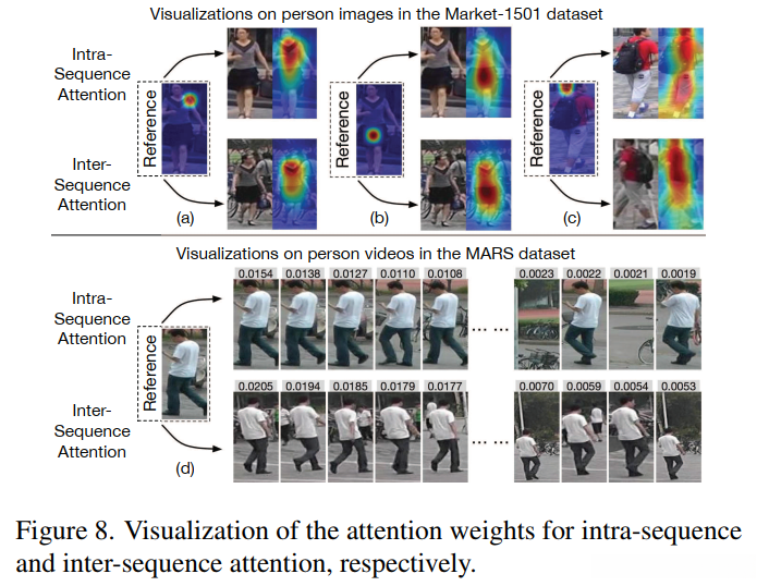 双注意力机制的可视化。为了更好地理解 DuATM 中使用的双重注意机制,我们在图 8 中显示了一些中间可视化结果。由于每个序列中的学习特征向量是上下文感知的,参考每个特征向量,序列内注意力可以集中在来自同一图像或视频的与上下文相关的身体部位或步态上以改进自身,而序列间注意力可以同时集中在语义一致的身体部位或来自相反图像或步态的图像或步态上视频生成其对齐的对应物,即使参考特征是从图 8 (c) 中的损坏区域导出的。因此,在 DuATM 中,特征序列在语义上进行了细化和对齐,从而进行了适当的比较。