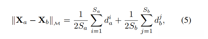 然后,我们通过平均池化聚合这些距离来定义特征序列 Xa 和 Xb 的距离,如下所示: