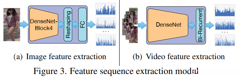 在 DuATM 中,我们采用 DenseNet-121 [15] 作为特征序列提取模块的主干。由于 DenseNet 中每一层与所有后续层之间的直接连接,局部细节可以更好地传播到输出以丰富最终的特征序列。具体来说,图像和视频输入的网络架构略有不同。