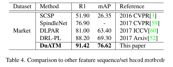 与其他基于特征序列/特征集的方法的比较。在表 4 中,我们将我们的方法的性能与几种现有的基于序列/集合的方法进行了比较 [3、59、60、52]。因此,DuATM 不仅可以自适应地推断局部模式之间的语义对应结构,还可以自动消除序列中的局部损坏,我们的方法比基于 body-part 的方法(例如 SpindleNet [59]、DRLPL [52])和密集的- 基于数据集 Market-1501 的匹配(例如,SCSP [3])方法。