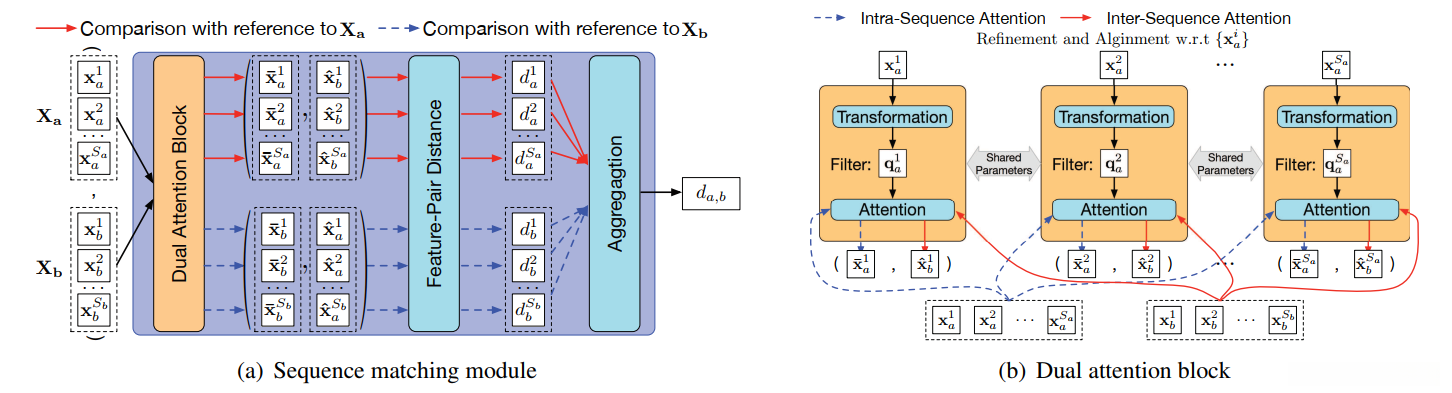 为了清楚起见,我们在图 4(a)中说明了 DuATM 的序列匹配模块,其中将两种类型的注意程序集成到一个双注意块中,用于特征序列的细化和对齐,如图 4(b)所示。在细化和对齐之后,通过聚合每个序列对的细化和对齐的成对特征向量之间的多个局部距离来计算整体序列距离分数。