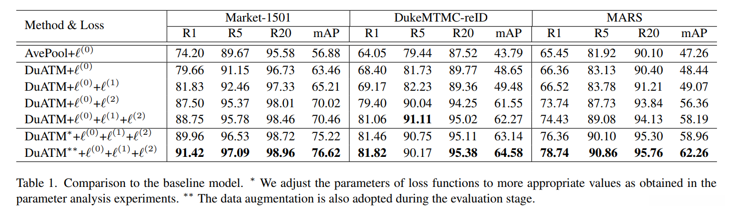 DuATM 训练有不同的损失。为了评估每个损失和双重注意力块的贡献,我们训练 DuATM 并使用以下四种设置报告结果:a) DuATM+ℓ(0),b) DuATM+ℓ(0)+ℓ(1),c ) DuATM+ℓ(0)+ℓ(2),和 d) DuATM+ℓ(0)+ℓ(1)+ℓ(2)。请注意,DuATM 是基于 DenseNet 构建的。因此,我们以 DenseNet 作为基线提取特征序列,使用平均池化层形成整体特征向量,并使用欧几里德距离来比较特征向量。baseline用三元组损失 ℓ(0) 进行训练,表示为 AvePool+ℓ(0)。实验结果如表 1 所示。从表 1 中可以看出,在所有三个数据集上,DuATM+ℓ(0) 的结果始终优于 AvePool+ℓ(0)。这证实了在 DuATM 中使用双注意力块的有效性:使用具有双注意力匹配机制的上下文感知特征序列比基于平均池的单特征向量方法更有效。加入去相关损失 ℓ(1) 和交叉熵损失 ℓ(2) 后,性能进一步提高。由于去相关损失 ℓ(1) 不会带来任何额外的监督信息用于判别,因此 DuATM+ℓ(0)+ℓ(1) 相对于 DuATM+ℓ(0) 的性能增益较小。有趣的是,当加入交叉熵损失时,性能得到了显着提升。这可以归因于身份标签带来的监管信息。最后,当结合所有三个损失函数时,精度进一步提高。