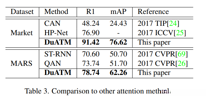 DuATM 的消融研究。为了验证 DuATM 中序列内和序列间注意力的效果,我们在 Market1501 上分别评估它们中的每一个,表示为 Intra+ℓ(0) 和 Inter+ℓ(0)。实验结果如表 2 所示,其中 DuATM+ℓ(0) 只不过是 Intra+Inter+ℓ(0)。我们可以从表 2 中观察到,联合使用两种注意力,即双重注意力,比只使用一种注意力可以提高性能。这证实了使用双重注意力机制的重要性。