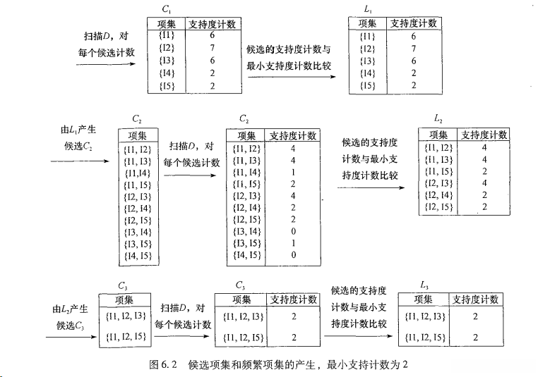 假设最小支持度计数为2,即min_sup=2,则最小支持度为 2/9约22%。根据Apriori算法 计算,过程如下: