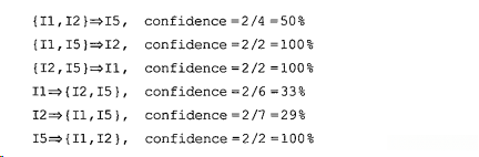 如果最小置信度阈值为70%,则只有第2、第3和最后一个规则可以输出,因为只有这些是强规则。