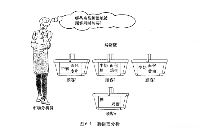 频繁项集挖掘的一个典型例子是购物篮分析。该过程通过发现顾客放入他们“购物篮” 中的商品之间的关联,分析顾客的购物习惯(见图)。这种关联的发现可以帮助零售商 了解哪些离品频繁地被顾客同时购买,从而帮助他们制定更好的营销策略。例如,如果顾客 在一次超市购物时购买了牛奶,他们有多大可能也同时购买面包(以及何种面包)?这种信息可以帮助零售商做选择性销售和安排货架空间,导致增加销售量。