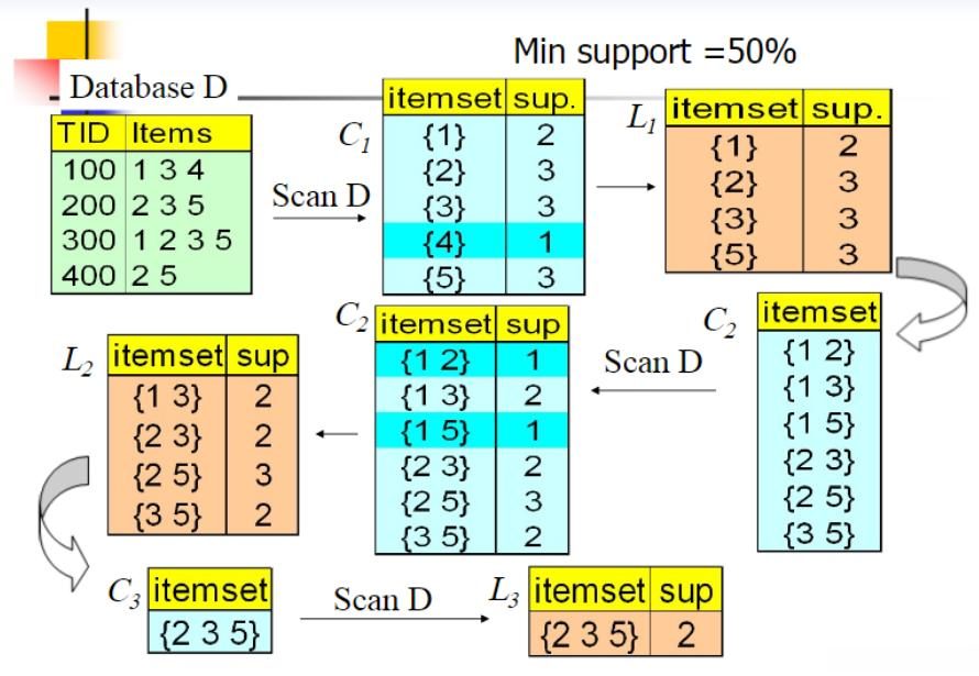 - 从2项集生成3项集,(1,2,3)(1,2,5)(2,3,5)只有(2,3,5)满足要求;