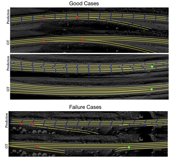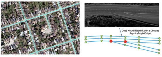 DAGMapper(基于其在ICCV 2019上的研究成果用于学习车道拓扑地图)进一步优化了对复杂场景的处理过程。该系统特别关注于分叉与合并等具有挑战性的交通情况,并通过利用激光雷达强度图生成更为精确的有向无环图(DAG),从而实现了对传统HRAN方法中使用的简单折线模型的有效替代。