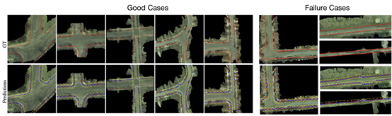 HRAN采用每像素5厘米分辨率,在20厘米精度范围内实现约91%的召回率(FRR)值。主要故障源于漏掉或多余的车道线检测结果。需要注意的是,在某些情况下绝对准确并非最终目标(NIST),因为人工校验仍需进行以修正错误判断的情况。这些问题相对容易解决。通过未来的'深度边界提取器'项目采用更高梯度图像处理技术可能会有效识别并修正FP栏杆被误判为车道线的问题